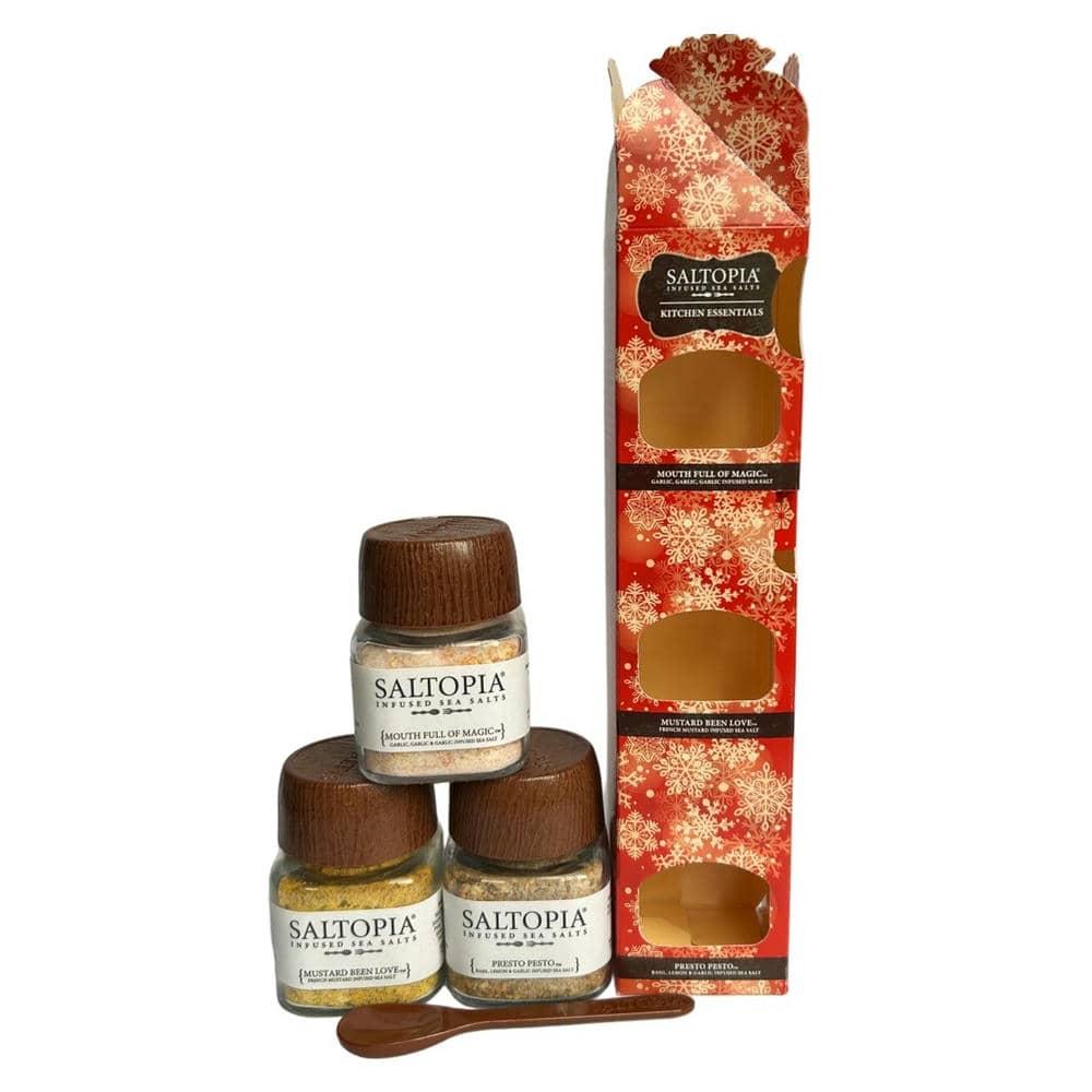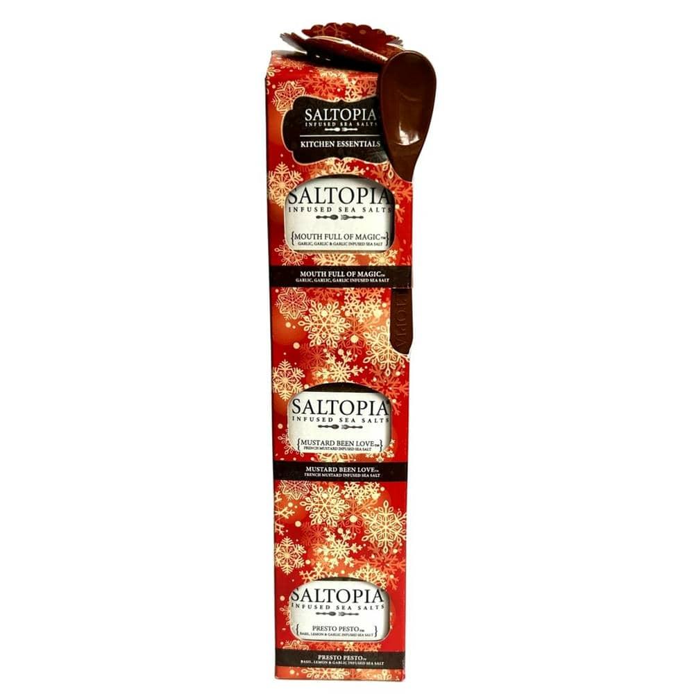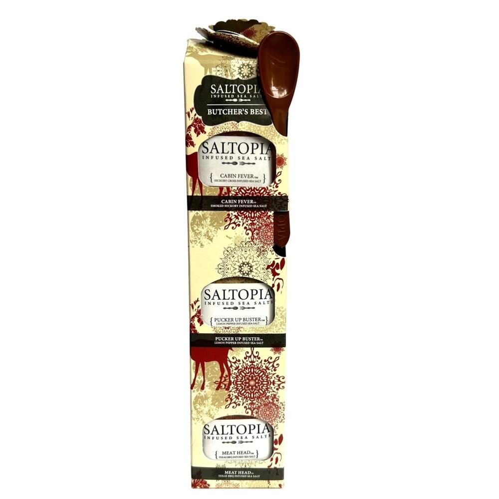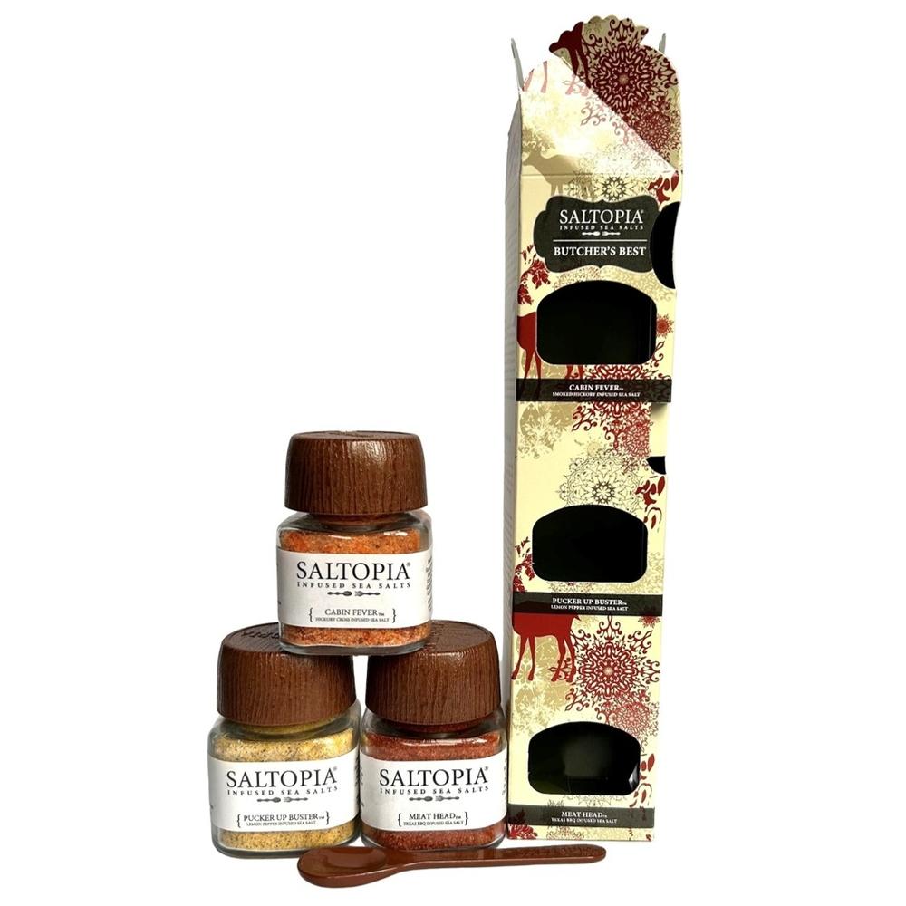 These gift towers make the perfect stocking stuffers! This gorgeous set includes 3 separate gift towers featuring 9 total jars of flavored salts, 18 recipes, 3 signature salt spoons! Each tower has its own unique flavor theme: Butcher’s Best for protein lovers, Essential Kitchen for the must-have pantry favorites and Garden Fresh from garden to table herbs. Present the complete trio or surprise three different recipients! Our ingredients are 100% pure, ethically sourced and made in the USA. Shelf life is 3 years from the date of the receipt. Store cool & dry.
